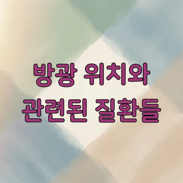 방광의 위치와 관련된 질환으로는 방광염 , 과민성 방광 , 요실금 등이 대표적이라고 할 수 있어요. 이러한 질환들은 방광의 기능 이상이나 위치 변화와 관련이 있을 수 있답니다.